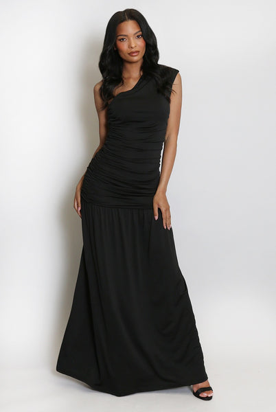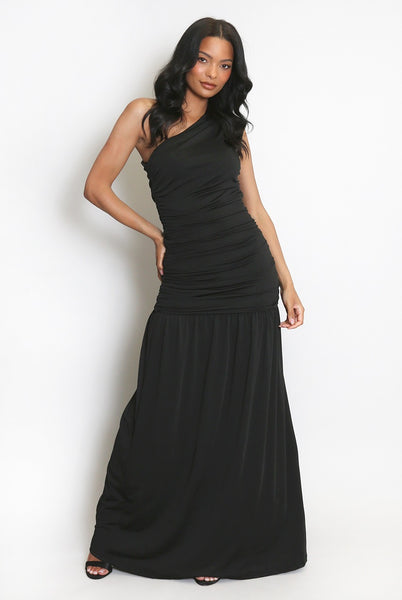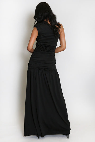 Fallegur síður kjóll í svörtum lit, mjúkur og þægilegur í að vera. Kjóllinn er glæsilegur í sniðinu en hann kemur yfir aðra öxlina og er aðsniðinn að ofanverðu og efnið rykkt, sem kemur virkilega vel út. Pilsið kemur svo lausara niður og útkoman er gullfalleg. Efnið gefur eftir og kjóllinn er mjög klæðilegur.